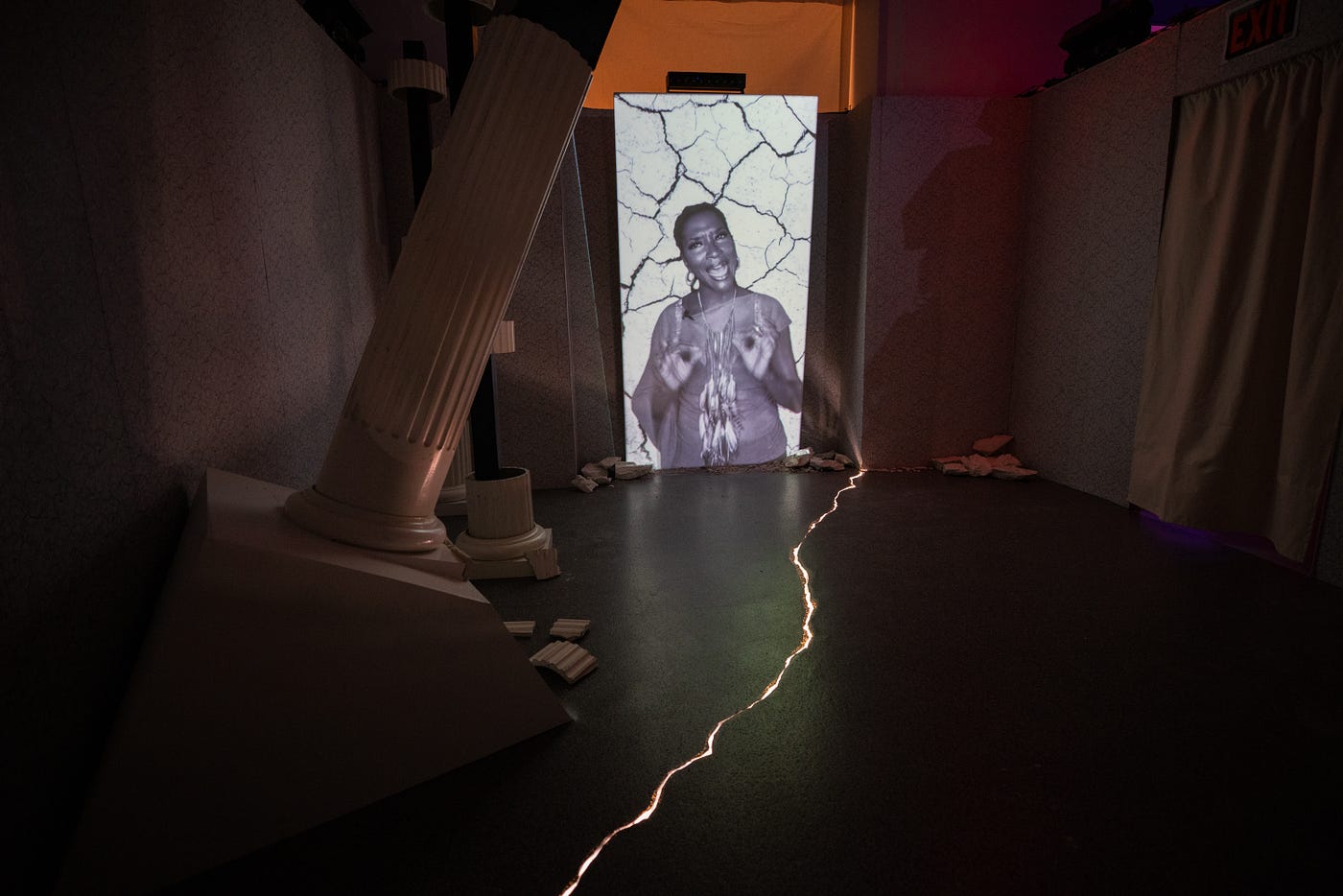 Later, in the ninth room, two crumbling columns and cracks through the floor represent the slow collapse of white supremacy as it gives way to Black liberation, a metaphorical interpretation of playwright Liza Jessie Peterson’s text, which she also delivers on video.