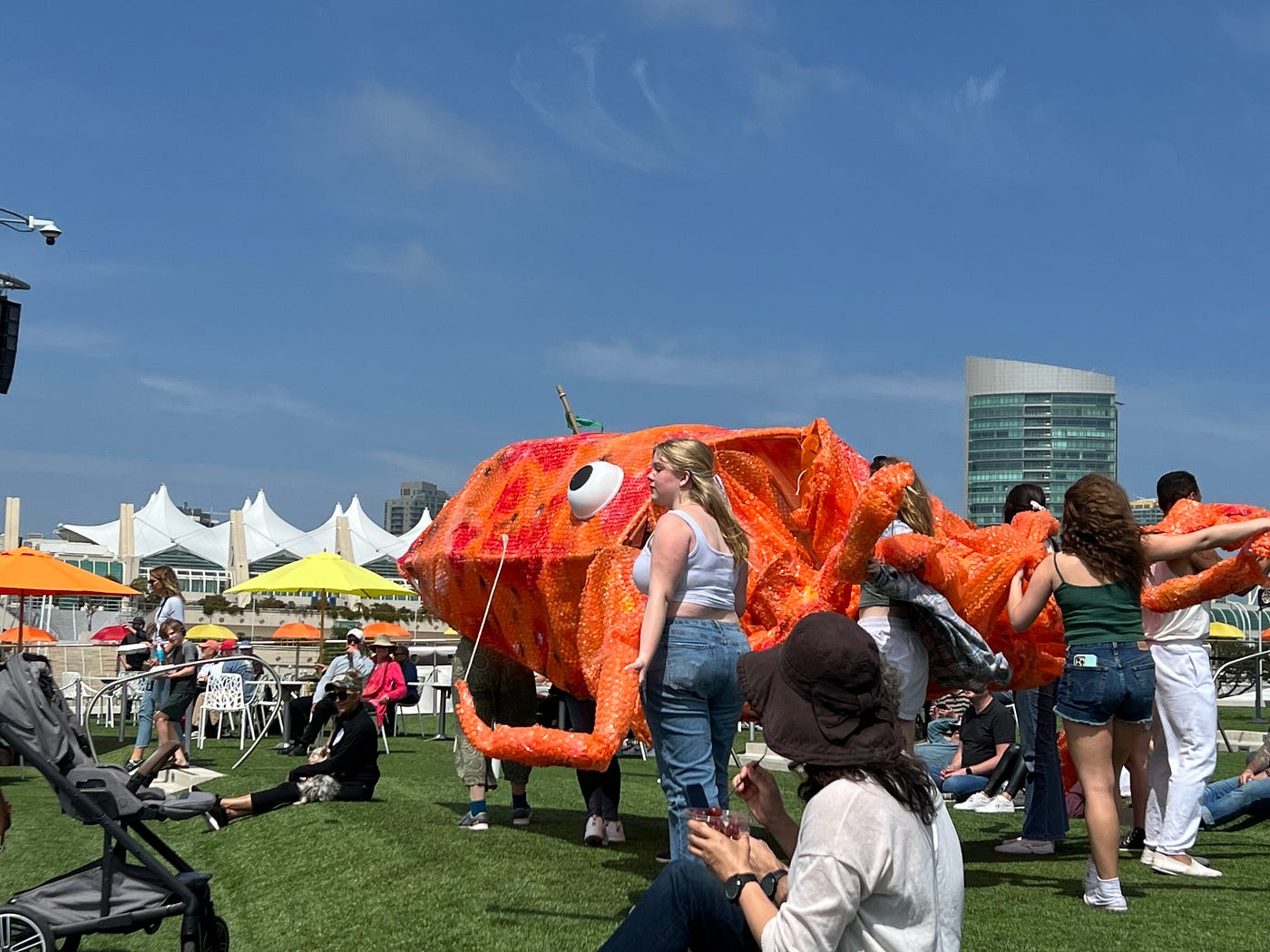 So we got some beers and grub — but not grubs — at the Burger, Bait, & Beer spot. My running buddy got a “small” shrimp taco that was the size of like three fast food tacos stacked side by side. I got the Pastrami Tsunami burger and a blonde ale from Coronado Brewing. Perfect waterfront food. All with time to spare to head to the Rady Shell lawn and catch Choreo & Fly.