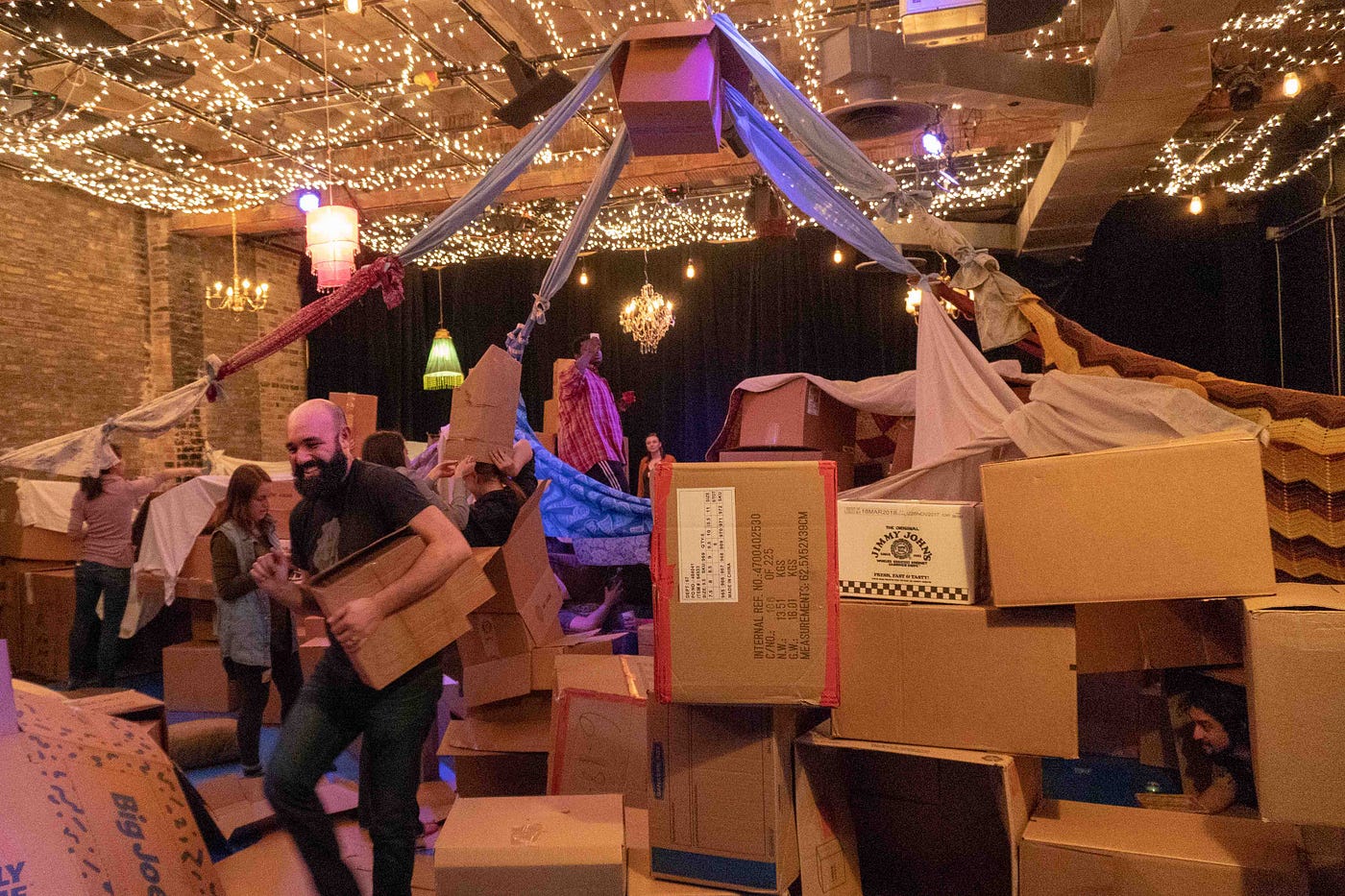 The Adult Night Experience: Enter a world of play and creation as Filament Theatre transforms into a fort building fantasy. With towers of cardboard boxes, baskets of sheets, buckets of clothespins, adults step back into the imagination of their childhood. With theatrical design elements of sound and lights working together to inspire creativity, friends old and new are swept away in the adventure!