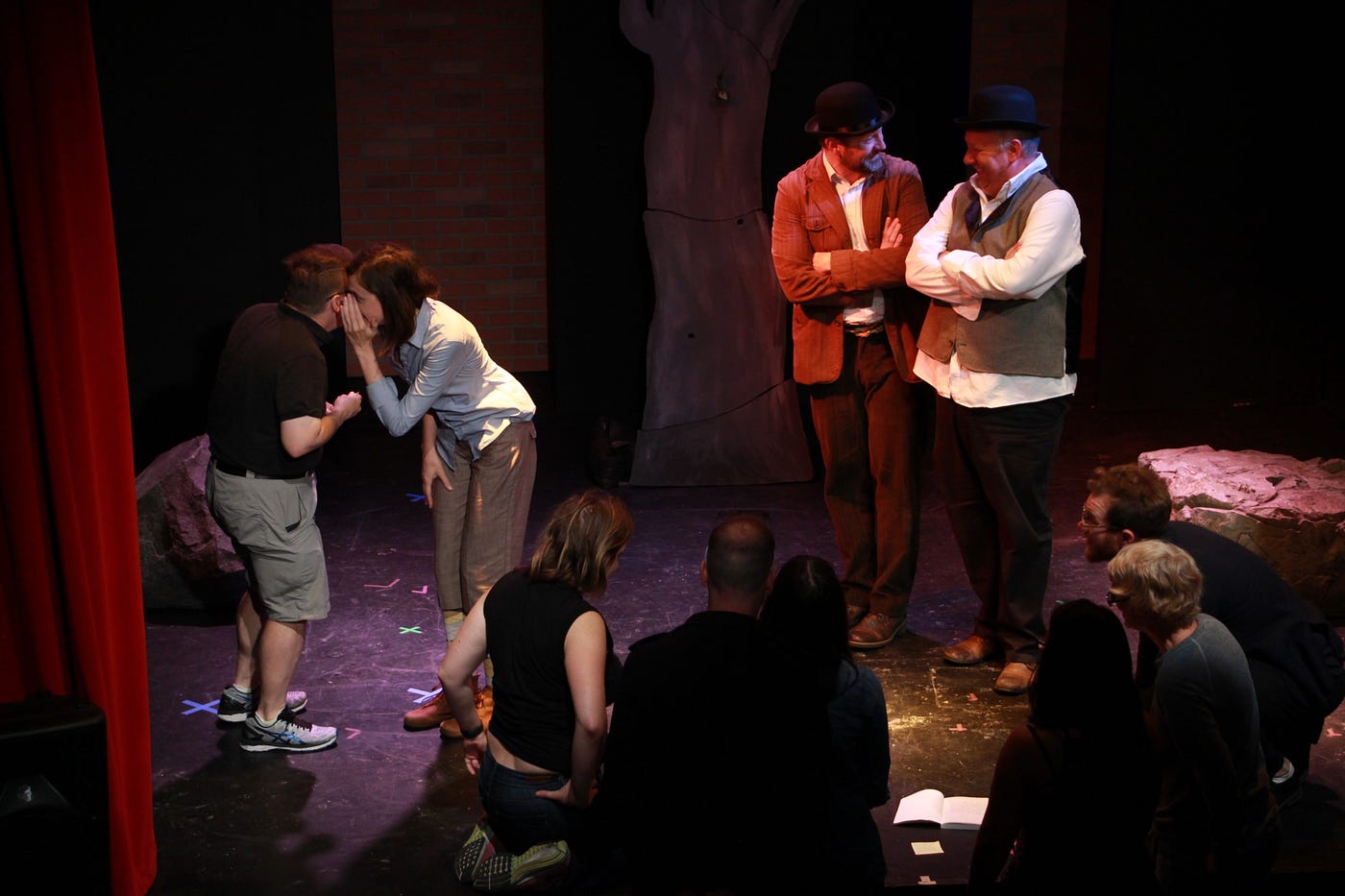 JEFF: We’ve told the story of the inspiration of Escape From Godot before, including on Episode 233 of the No Proscenium podcast, but here’s a quick recap: I was riffing with a friend about odd escape room concepts and made a joke about a Waiting for Godot escape room. When I told Andy, her eyes grew wide and she said, we have to do that. The timing was right to mount a show for the Hollywood Fringe Festival even though we didn’t quite know how we were going to do it– just that it needed to happen.