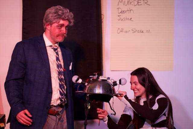 BJ had another audience volunteer go around the room to measure peoples’ heights to see if any might be suspects in the case we were helping him solve. He also had a lie detector helmet that an audience member wore while he interrogated them (and possibly lit up with a remote?). At one point he even delegated medication administration to an audience member and had her chucking handfuls of pills into his mouth like popcorn.