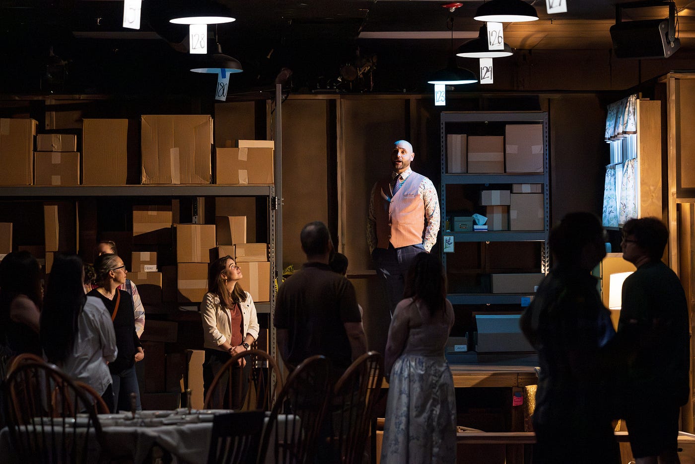 One flashback took us to a holiday dinner hosted by our two main characters. This dinner took place in one corner of the giant room, around a group of participants who were seated at a dinner table, while the rest of us looked on. There was mounting tension in the air as our two main characters argued in front of their guests — an awkward, yet authentic, moment for anyone who’s ever been caught in the middle of a couple’s quarrel, or been the people fighting in front of their loved ones.