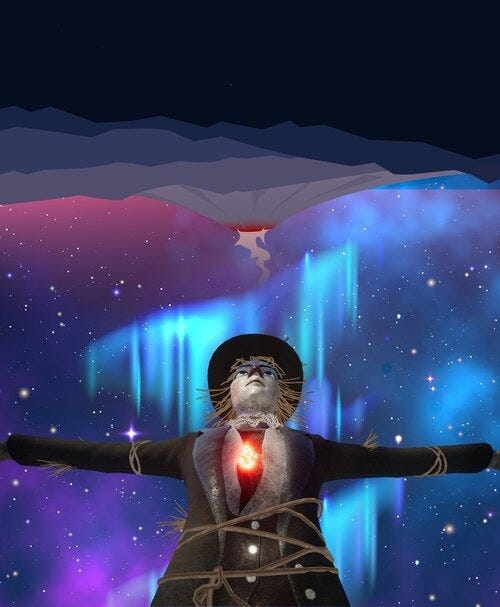 The scarecrow turned back and beckoned me to follow. In fact, they all raised their arms, waving at me to join them. So I did.