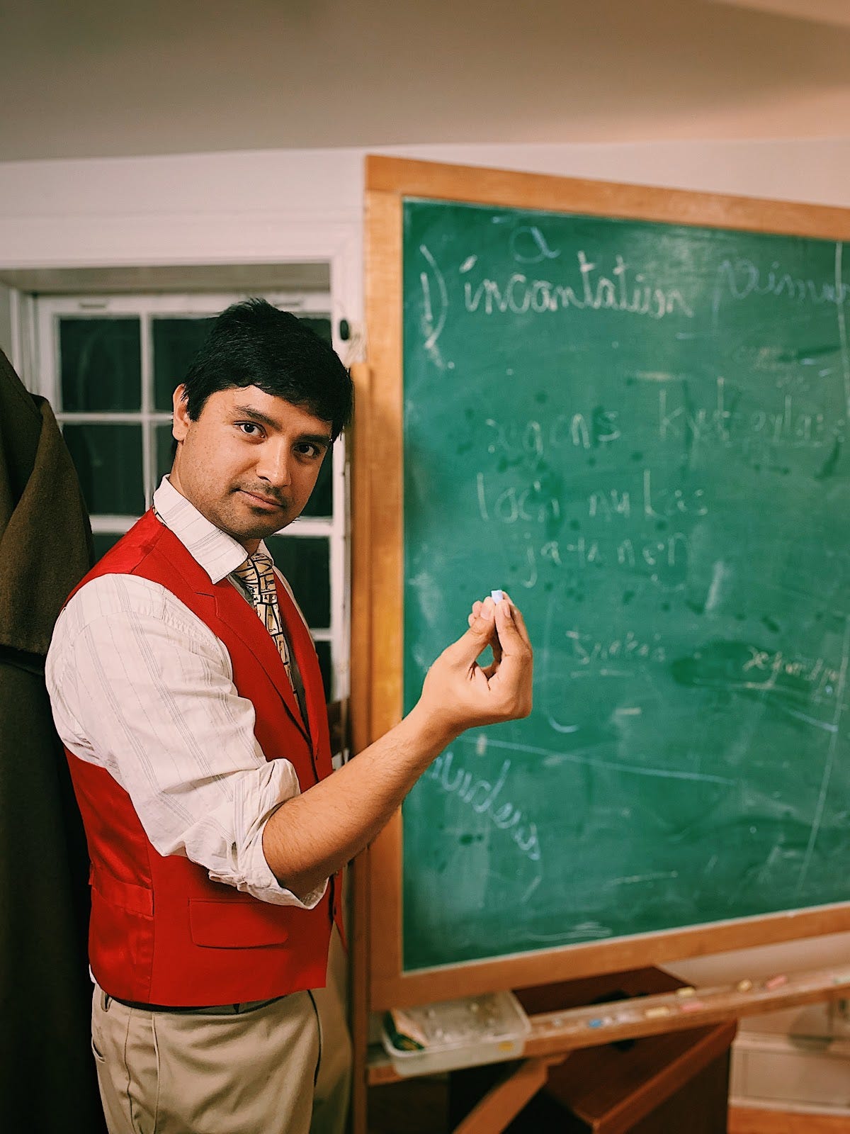 The immersive production Basic Principles of Incantation & Applied Esoterics for persons of breeding or talent created by Max Seidman and Sharang Biswas answers this exact question. In a small classroom in the West Village, we are invited to join Professor Alastor Silby in the study of Esotery. Firstly our professor states, “We choose to refrain from using such vulgar terms as magic, sorcery, or spells in this class.” Dressed in a bright red waistcoat, with a rather fantastical alphabet-themed tie, Professor Silby (played by Biswas) is instantly enchanting and likable. He exudes confidence and love for his subject while lecturing at breakneck speed with wit and charm. His slight British accent takes me straight back to my school days, as well as my imagined days in Hogwarts.