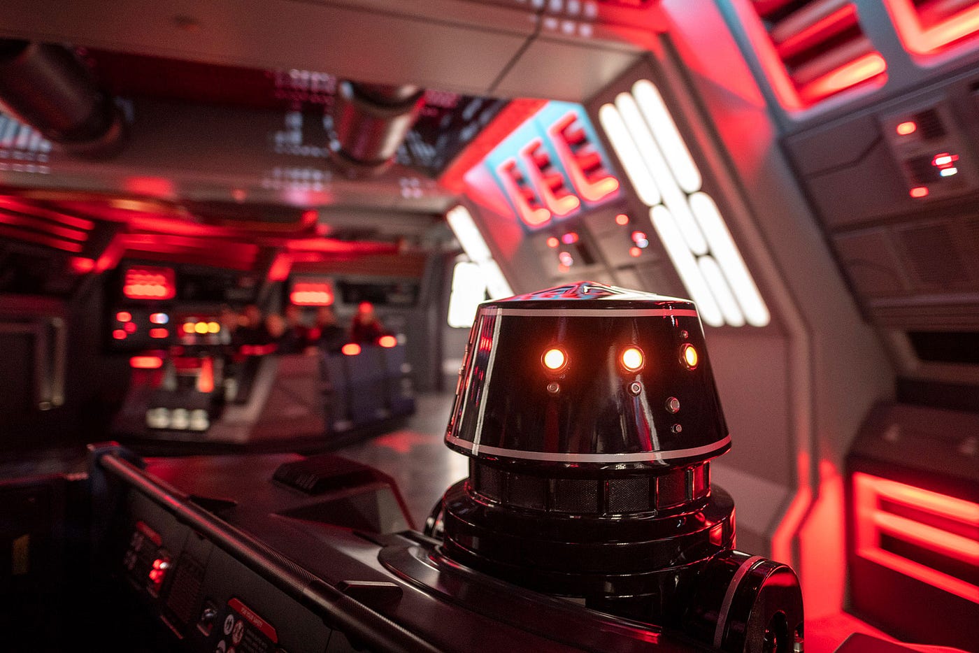 The buzz around Rise of the Resistance and the elusiveness of getting a spot in its virtual queue means you’ve probably seen at least one of the ride’s Insta-ready epic reveals on social media: a Star Destroyer’s hangar bay, in which an entire company of Stormtroopers is set in front of an enormous window looking out into deep space. We gaze, slack-jawed at their intimidating formation as TIE fighters whoosh by and another Star Destroyer lingers in the distance. The neon glow of the window’s edge is reflected in the shiny, black floors while stern First Order officers, clad in all black, stare back at you, at the audience.