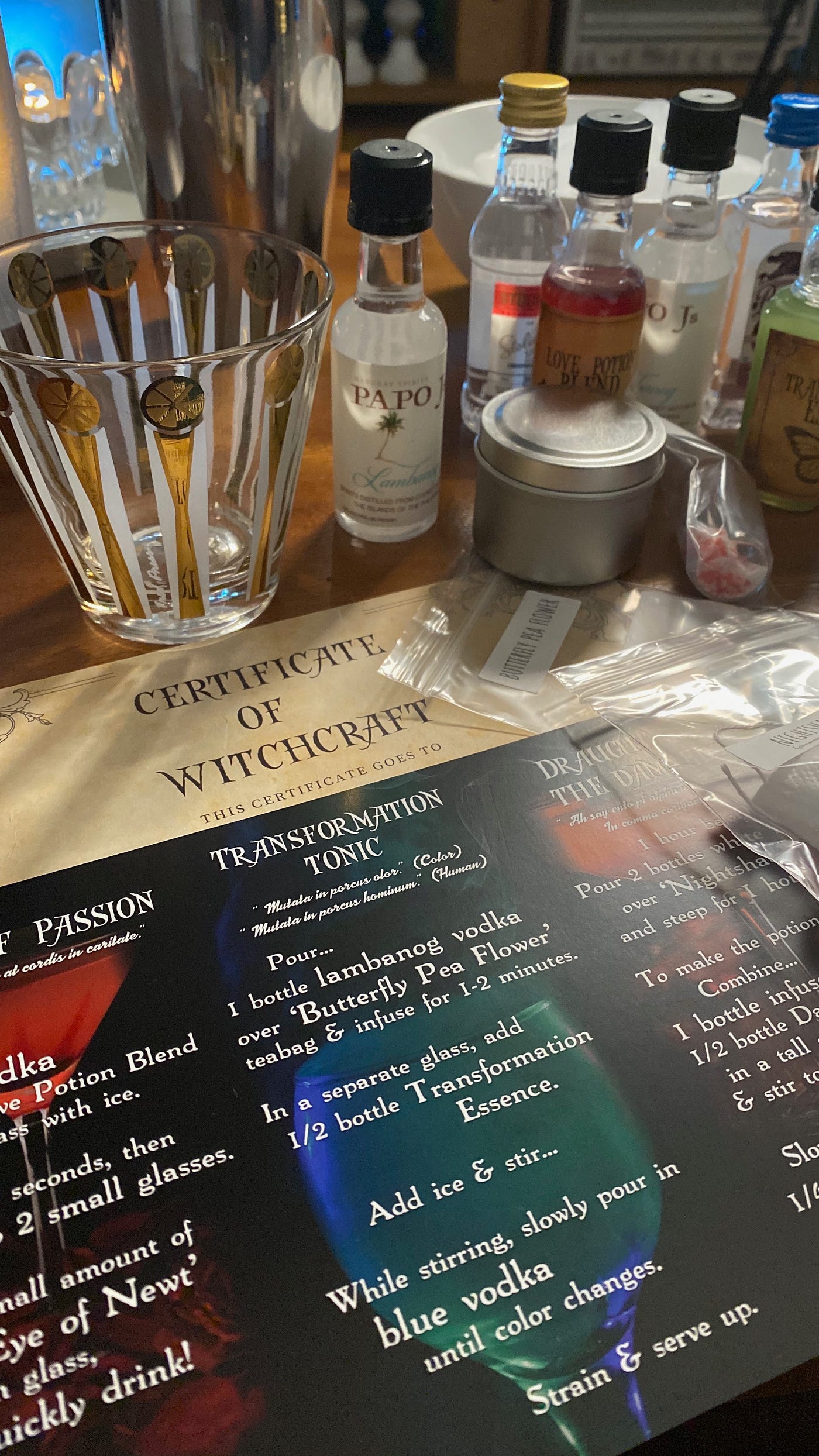 And then there were lots of questions about how to make the drinks. As the witches guided the audience through the process, the chat immediately clogged with pleas for clarification. Ultimately, there was a disconnect between concocting the drinks and the show’s entertainment; energetic momentum generated by the musical interludes dissipated during the clunky mixology lessons, which required too much time and too many steps. The cocktails themselves were interesting and flavorful, if too sweet for my palate.