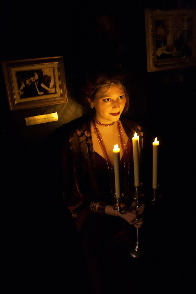 When Madame Daphne reads my tarot cards, she does so with stunning accuracy and a mischievous, knowing smile. Perhaps it is the influence of the cocktail, but the line between fantasy and reality begins to blur; I am ready for the séance. She stands up suddenly, clutching a candelabra and muttering something about an invisible parrot who has escaped his gilded bird cage, and then beckons us to go through a door in the corner of the room. We follow her into a dark hallway where, her face lit only by flickering candles, she tells us the story of Harry Houdini’s life and mysterious death. After we have sworn ourselves to secrecy, she leads us through the hallway and into the private chamber where the séance will take place. In the center of the room is a giant, mahogany table where we are told to sit and join hands, forming a circle. Madame Daphne points out items around the room that once belonged to Houdini and his wife — a straight jacket, a wedding ring, photographs, various props and furniture — which will help us in calling his spirit forth. We call out to Houdini, inviting him to join us, and the lights begin to flicker as eerie music plays louder and louder. When a creepy message is found on a chalkboard, it is clear we’ve made contact with the ghost of Houdini — and then things begin to go horribly wrong.