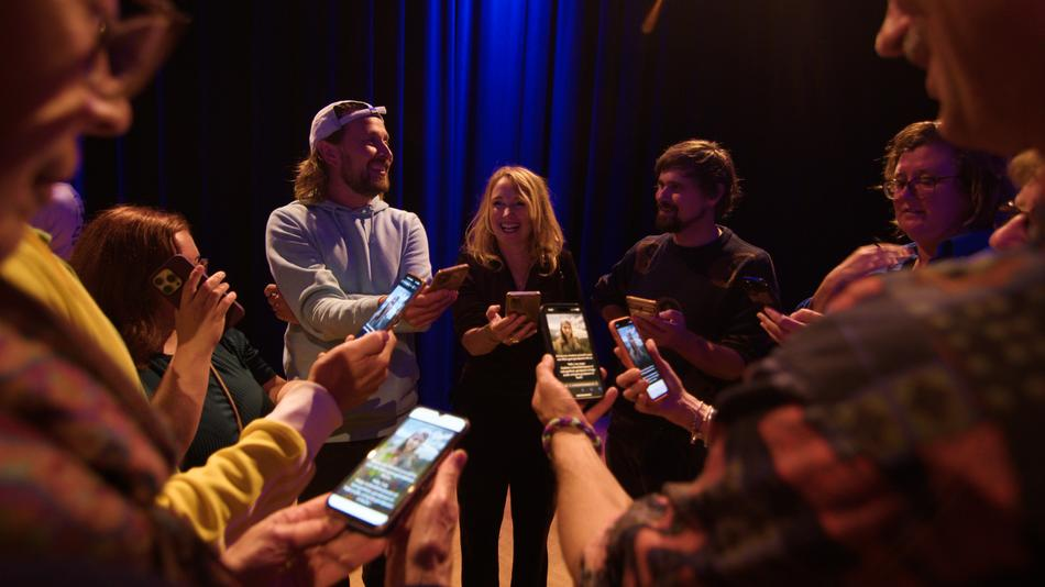The Smartphone Orchestra’s Ancestors takes an unconventional approach to live immersive storytelling, using participants’ smartphones as the primary medium. Instead of the usual “please put your phones away” directive found in most shows, users’ own phones are central to the experience. Ancestors encouraged participants to take selfies, which were then merged with another participant’s image to generate an AI-created “ancestor.” As the experience continued, these generated faces evolved into projected future generations, culminating in a distant descendant based on the entire group and strong themes of identity, community, and sustainability. Because the show’s directives came directly from participants’ own phones, devices they are inherently familiar with, there was a natural acceptance of the process that might not have been achieved had the same prompts been delivered via a central screen or external controller. Beyond the technological and philosophical implications, Ancestors also functioned as a surprisingly effective icebreaker, fostering connections between participants in an organic and interesting way.