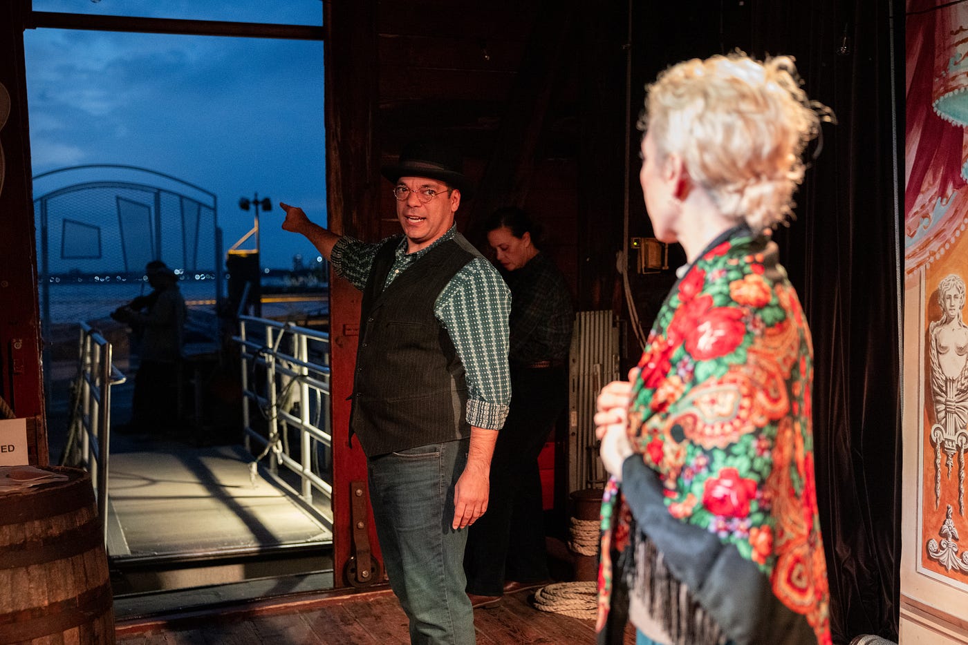 You make a play about time by putting the play in an historic railroad barge, floating on the very water that is such a big part of the Red Hook story. Sea level rise and Hurricane Sandy, the forces that nearly destroyed Sunny’s and this community, have extra poignance when the theater itself is gently swaying on the bay. And then you move the audience to Sunny’s, giving them a meditative walk to the bar itself. This is the most specific of site-specific works.