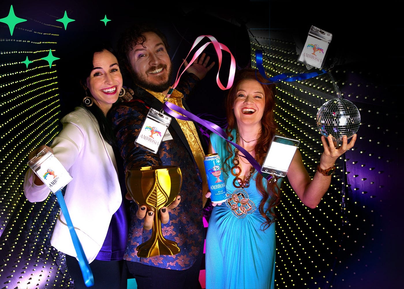 The show’s mythology-based corporate world made for a fun aesthetic, though at times it felt like a loose overlay rather than an integral component. Aside from the occasional reference to a character’s centuries-long career history, the gods and demigods largely behaved like eccentric office workers rather than celestial beings. In addition, office karaoke song-and-dance numbers scattered throughout the evening (the show is bizarrely marketed as a “musical”) consisted of cheezy parodies of pop songs that halted the flow, especially as the evening’s festivities were coming to a close and many conversations, loose ends, and matchmaking pursuits were still unresolved. Ambrosia Inc.’s biggest strength lies in its cast. With a dozen and a half actors embodying their roles with enthusiasm and razor-sharp improvisation skills, the experience was playful and reactive.