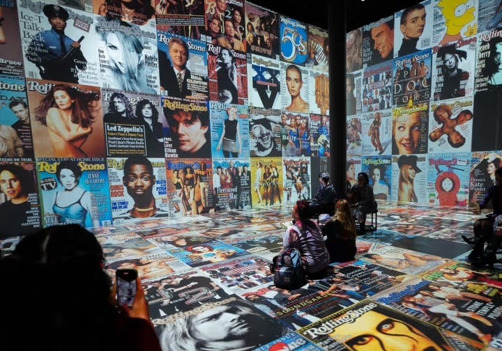 Amplified is a projection mapped documentary style exhibition of photo content from the magazine Rolling Stone. Over the course of about forty minutes, you are told a story of rock ‘n roll organized around a number of themes (freedom, cars, studio time) and then surrounded by pictures of musicians from the Rolling Stone photo archive. This experience is a mixed bag — while I found the content intriguing, the use of immersion here didn’t add anything of value.