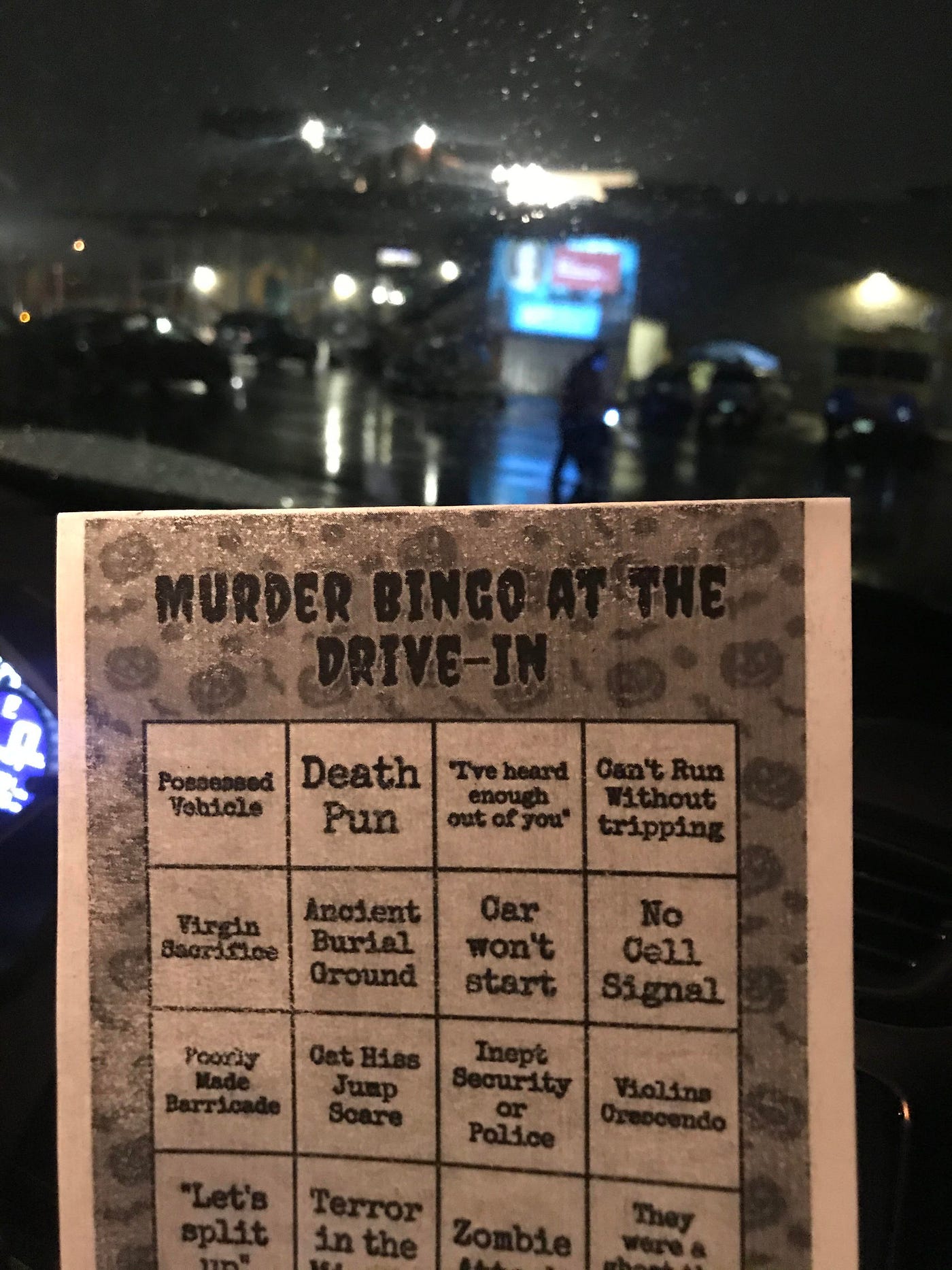 The entire experience also has an additional game layer with with Murder Bingo At The Drive-In. Populated with horror movie tropes like “inept security guard or police officer” and “can’t run without tripping,” each vehicle is instructed to stamp their bingo card as certain things were said or acted out. This drove home just how absurdly comical the whole thing was, and added a fun layer of interactivity.