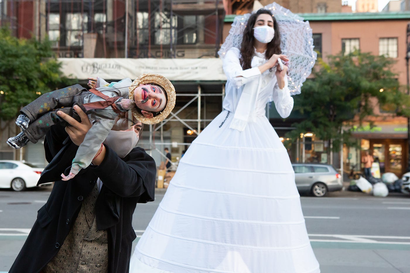 There are very few spoken words in Voyeur, and even those could be reduced further to heighten the hallucination-like atmosphere of the show. The artistic choice also has practical benefits: being able to hear masked actors through environmental noise while staying at a safe distance. (I must admit, there is something haunting in being unable to see the actors’ mouths as words are uttered.) Although interacting with the covered faces has become a new normal for me outside the theatre, encountering it in a performance context gave me chills because of how well it fits into the surreal world of Voyeur. Toulouse-Lautrec’s absentee father appears even more estranged, the beloved mother becomes even more unreachable (her six-foot skirt designed by Christopher Metzger certainly contributes to that effect, too). During a romantic dance of the young parents on 7th Street, the masks “spoiled” the idyllic picture, but not without a good reason. The artist’s parents were, after all, first cousins, and Toulouse-Lautrec’s genetic health issues are thought to be due to inbreeding.