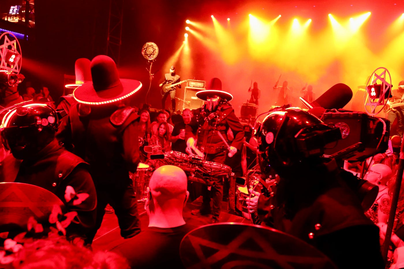 We are always eager to unleash our Zuesaphone, a keyboard-operated tesla coil that hovers over the space like a buzzing, crackling, semi-sentient, alien chandelier. All went smoothly in rehearsal, but when we rigged it up thirty feet above the floor of the Fillmore we saw some small out-of-place arcs and made the last-minute call to cut it. While it would have contributed much to the show’s overall effect, memorability and effectiveness, we maintain a low threshold where safety is concerned. Our aim is to uplift the audience, and it’s hard to do that if there’s a chance of someone getting hurt. The Horlwn, itchy-O’s choir of engineers, are working diligently to see that the coil is up and running for Hallowmass 2022 at the Summit in Denver on October 28th and 29th.