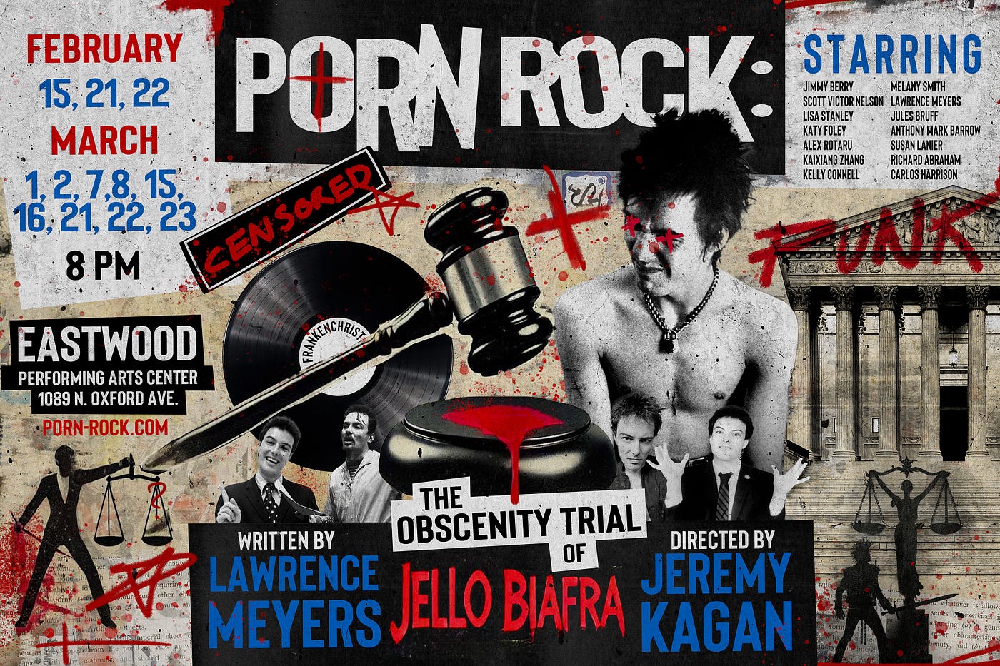 The show has 3 interactive elements: a pre-show where audiences provide lyrics for a punk rock song, a brief voir dire where guests are asked their opinion about issues relevant to the case, and a vote on Biafra’s guilt or innocence that determines how the show ends.