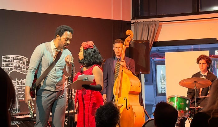 ME: In our initial workshop in January, we discovered how important it is to initially drop the audience into an active nightclub. This required the development of props, planned improvisations, and a general level of commotion and sound that made the audience feel like they were in a club atmosphere. We also saw how challenging it is to combine live jazz music and dialogue. Often the music was overriding what the actors were saying. So getting the actors properly amplified and the music properly subdued was a big challenge. But in this process, we also discovered that audiences really liked when there was a sort of disconnect between what the actors were saying and doing, and what the music was expressing. Almost like the actors were going through private moments of tragedy while the music conveyed a sense of a larger world that merrily continues on its path despite them.