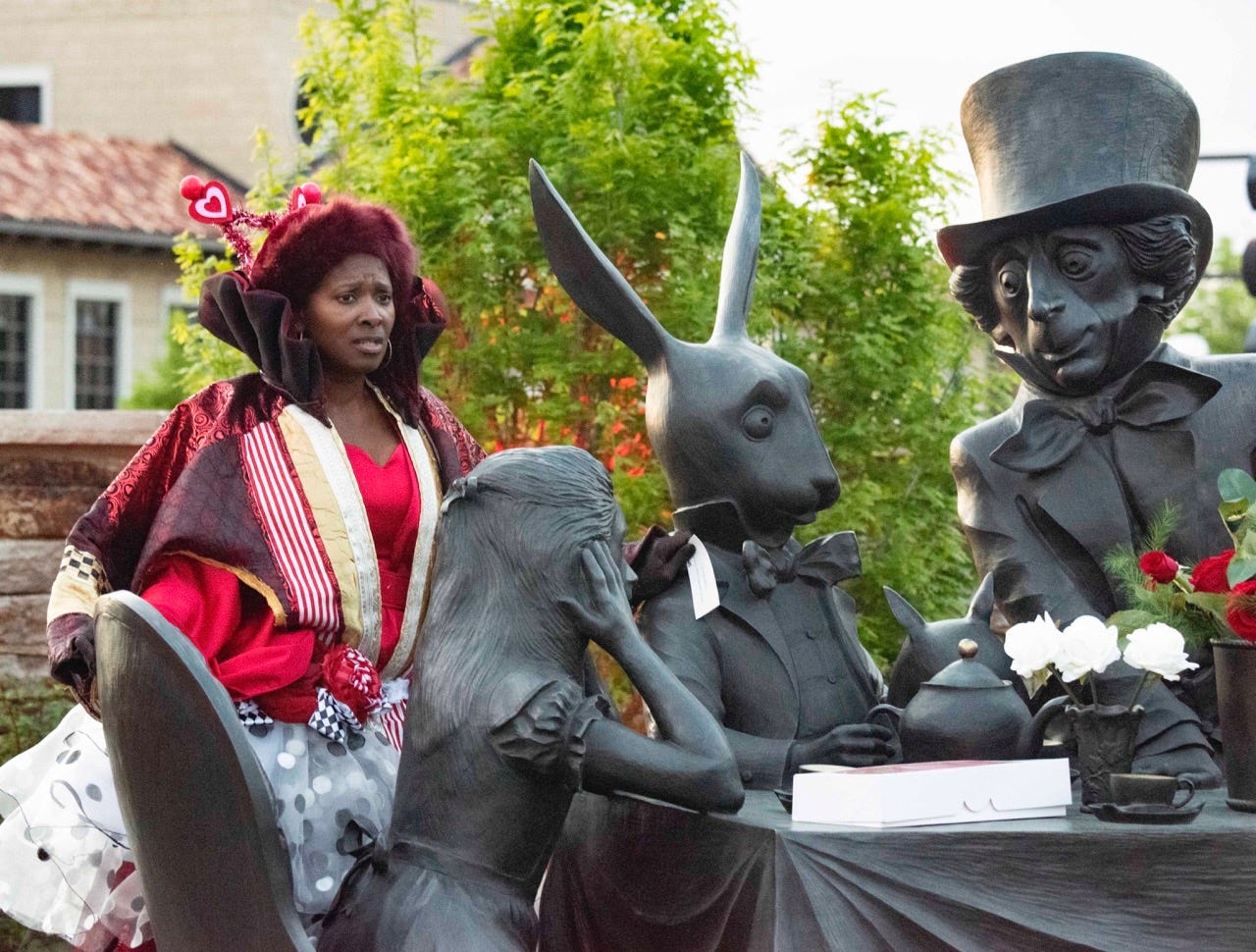 We proceeded to meet five different characters at five different stations setup around the beautiful and whimsical Museum of Outdoor Arts, including one scene inside Lonnie Hanzon’s Cabinet of Curiosities and Impossibilities. Each vignette was obviously relevant to the character (a series of puppet shows by Mr. Grimm, all ending in wolf attacks, for example) but their connection to Alex’s journey was less apparent at first glance. But, much like Mr. Grimm’s own stories, there was always a relevant lesson to be extracted from each engagement — one that provided some insight or wisdom on navigating life while remaining playful, and becoming comfortable and confident in our own skin.
