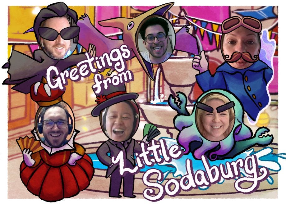 Before going any further, let me give The Traveler’s Guide to Little Sodaburg the highest recommendation I can. It’s a goofy, well-crafted, incredibly delightful confection of an online escape adventure. The art is gorgeous, the acting is silly but perfectly suits the tone, and the game continually surprises and provokes genuine laughter. Just go. Read no more.