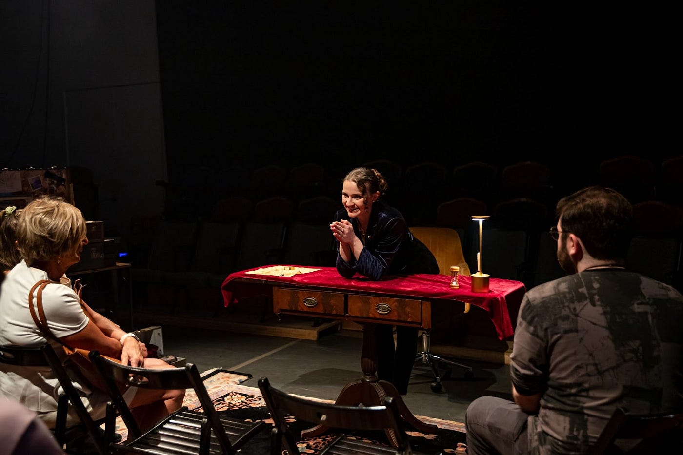 It’s in the right neighborhood, it’s versatile, and it’s interesting. But the experience as it currently stands feels unfinished. Chatting with an immersive performer in character is always a treat, but there doesn’t appear to be any structure to the experience — you are literally just chatting. Each room has its own theme and some light backstory can be chiseled out if you ask enough questions, but do not expect a plot, experiential activity, or transformative process. I would have loved to see a stronger incorporation of the time period in each room, and perhaps this would come with a smidge more structure. As the conversation is really free-flowing and fair game for anyone in the room, other audience members dropped the period aspect or referred to it jokingly, showing that they weren’t buying into the suspension of disbelief. And, your fellow audience members can make or break your experience. The piece also has strong lore and feels very guided in the onboarding and introduction, but after your time in the room is up, the experience ends without any formal offboarding. (In fact, we accidentally walked away with a wearable prop due to this — sorry friends!)