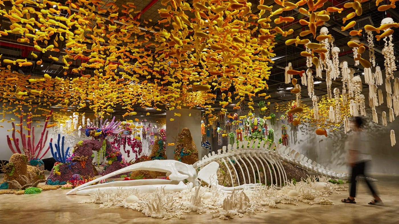 Presented by USC’s Fisher Museum of Art, Indonesian artist Mulyana’s Modular Utopia portrays marine underworlds through knitted environments and kinetic sculptures. His artistic philosophy views creation as an act of human endurance, a necessary foundation for the themes of his work.