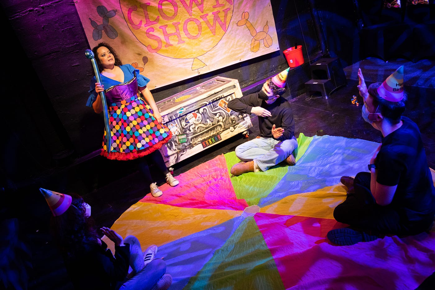 Clowntown mashes up stories from Perez’s work as a clown-for-hire with reflections from her alter ego, Pixie the Clown herself. Perez recounts nightmarish parties and monstrous children; Pixie wonders if exhausted adults can somehow preserve their sense of play. Mixed in with their stories are a series of volunteer-only party games.