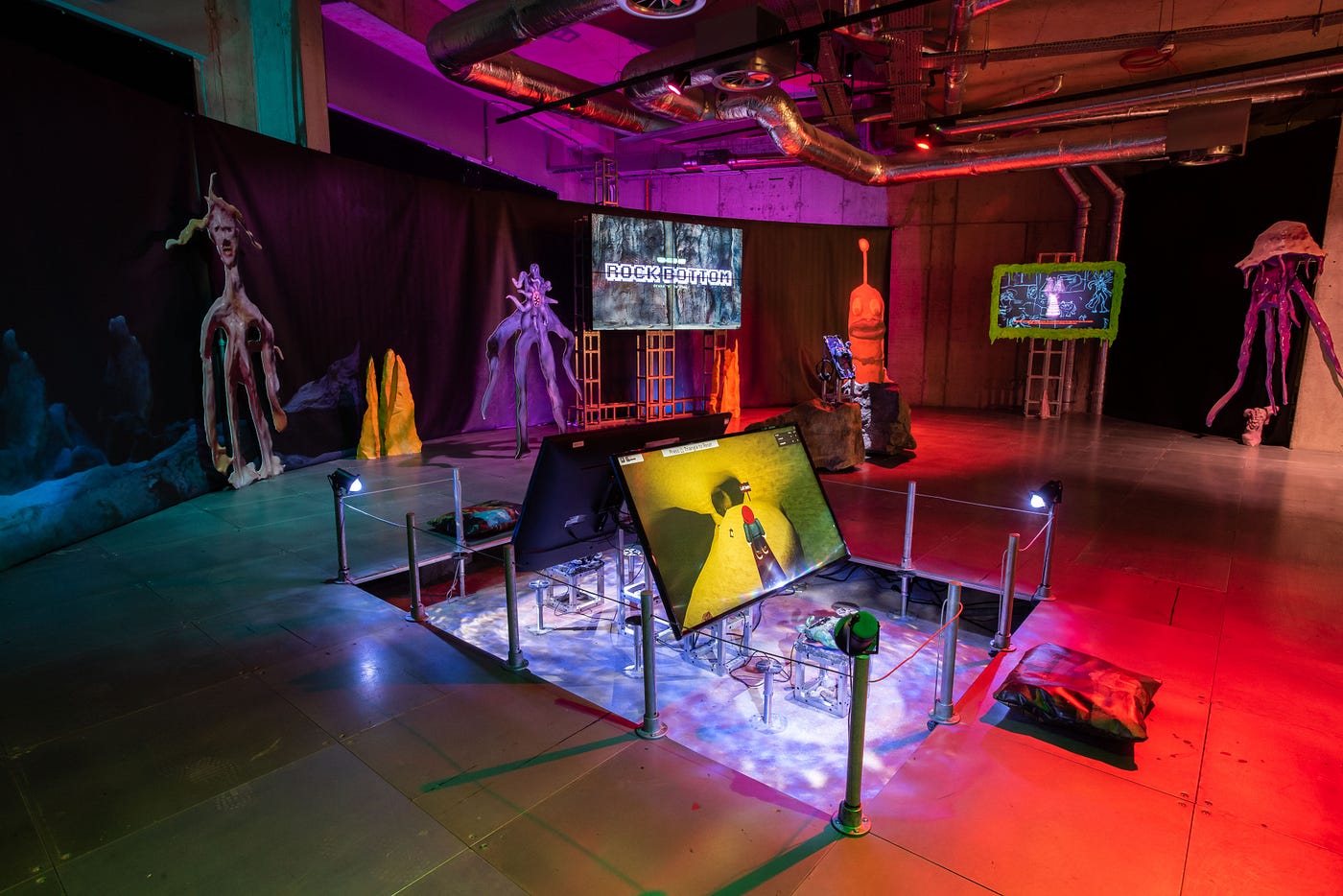 Devised from a miasma of queer, ecological, and Northern English influences viewed through a Spongebob-shaded glasses, what you experience is a sandbox-style gallery of different game experiences (with custom-designed handheld tentacle controllers), video works, and sculpture. And while on the surface a casual visitor might take Rock Bottom as maybe an underwhelming compilation of several artists’ work on the same theme, what impressed me is that the whole thing came from one creator.