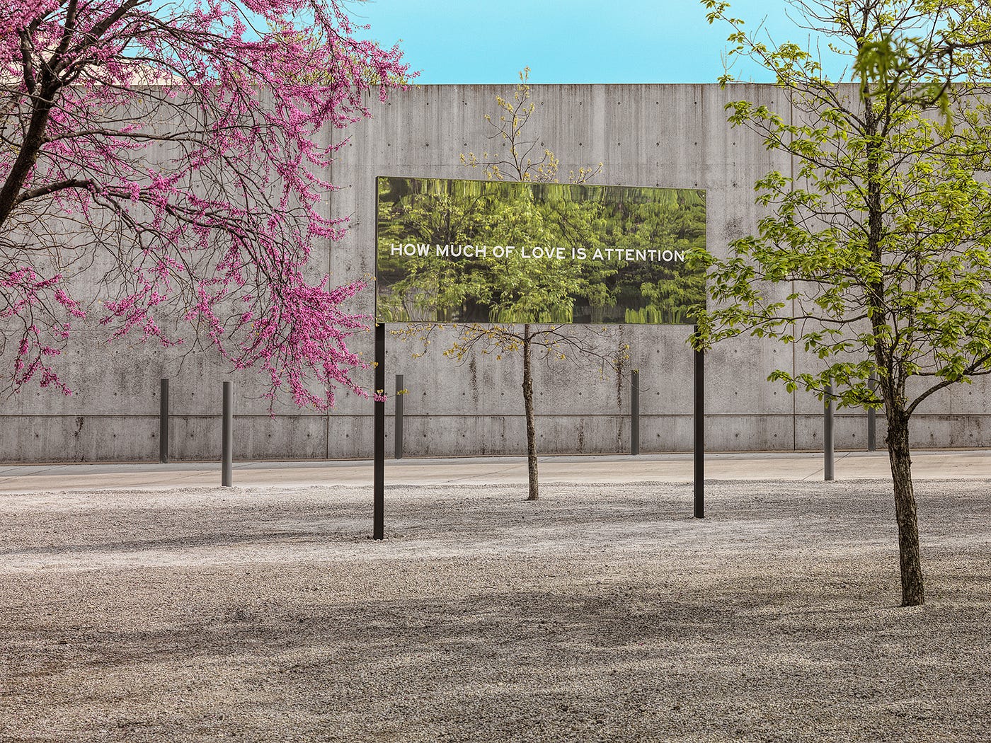 Wayfinding signage is vital — and often forgettable. For many, it’s a tool offering little beyond the utilitarian. Bass, however, transforms such signage into a resonant, poetic experience. Signs are divided up into four sections on the Pulitzer’s grounds. Mirrored billboards reflect their environment and, at times, letters vanish into the clouds: HOW MUCH OF LOVE IS ATTENTION becomes HOW MUCH OF LOVE IS ATTRACTION.