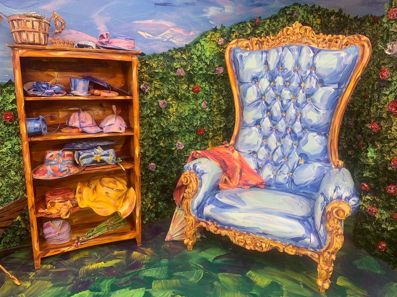 Everything is painted by hand in a 2D style, from the floors to the furniture to the leaves on plants. Even the props (for what is a selfie palace without thematic props) are painted, and guests are encouraged by sparsely-placed staff to try on stiff, paint-covered jackets and hats, sit on crackly, painted furniture, or fan themselves with painted fans for a perfect photo op.