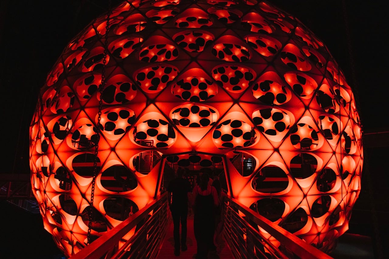 Walking into a dark warehouse space, it is impossible not to look up in awe at the gigantic alien spacecraft that appears to float in the middle of the air. It truly feels like a scene from Close Encounters as I gradually approach, alongside my fellow audience members, and climb up the tall scaffolding stairs to reach the center of the sphere. Once inside, seating comes in the form of rope hammocks, situated around the entire interior. Once we are all safely on board, the lights dim, and the music takes over.