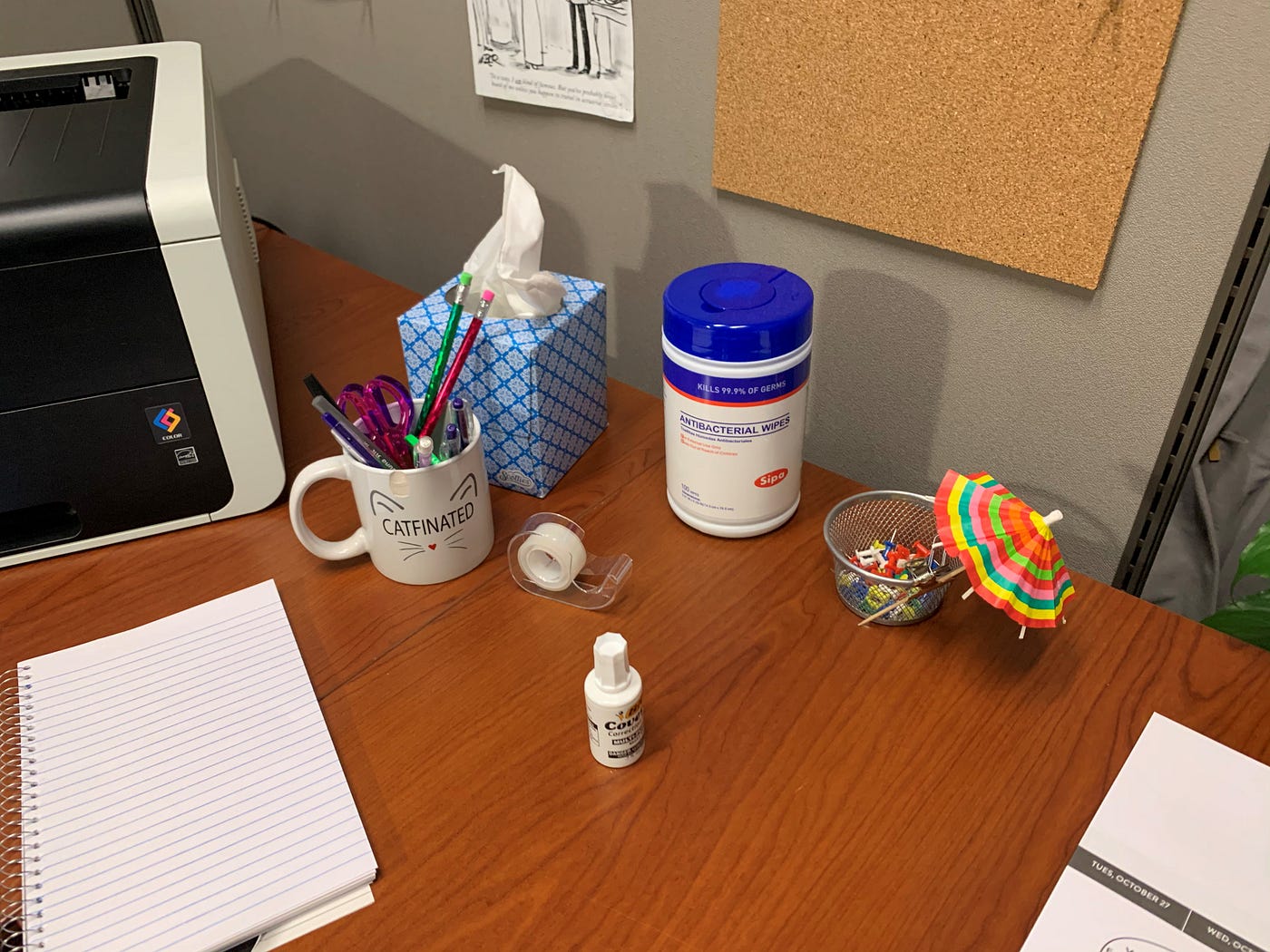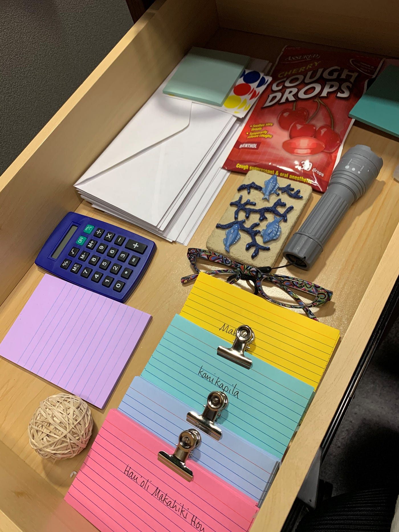 And everywhere, there are photographs and references to Hawaii, where Sarah Jane is taking her first vacation in 17 years of working for Harold, Adams, McNutt, and Joy, LLP. The background to her PC is a photo of a palm tree on a tropical beach. Alongside the cartoons on her corkboard are postcards from Hawaii. In her desk drawer, nestled amongst office supplies and hard candy, are postcards featuring Hawaiian phrases like “Hau’oli Makahiki Hou” (“Happy New Year”) that Sarah Jane has presumably been learning for her trip. They feel, to me, like a cry for help. A daydream of escape from her life as a Midwestern actuary. I’m torn between feeling happy for Sarah Jane that she’s finally getting to go on her dream vacation and sad for her that she will, eventually, have to come back.