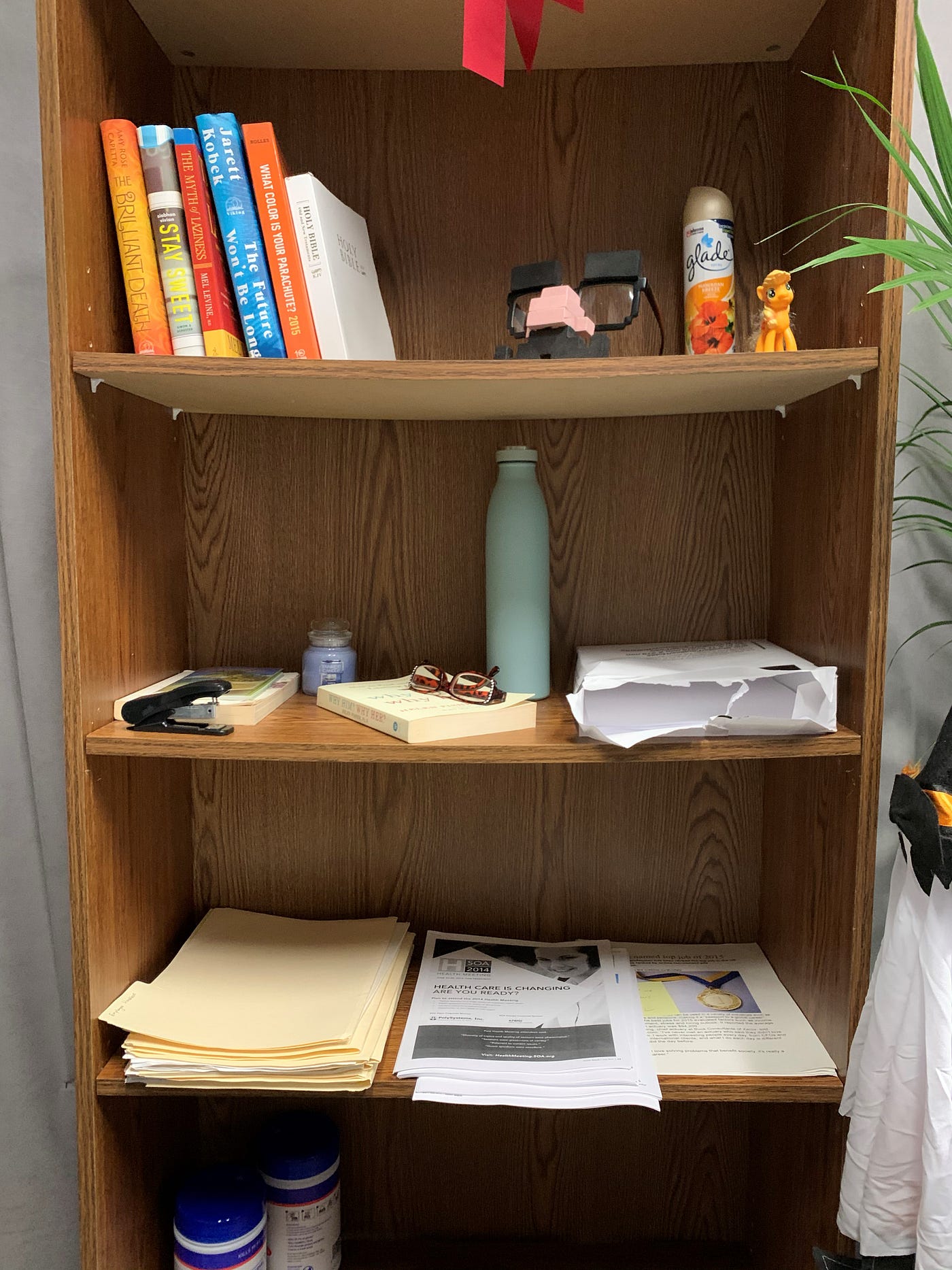 I am next given a key to Sarah Jane’s office and instructed to enter it and begin my shift. I take a moment to gather my thoughts and settle into Sarah Jane’s chair, her office, her life. Sarah Jane’s cubicle looks like many I’ve seen in offices across the city. A sensible grey cardigan is draped across the back of her chair. A pair of pink tennis shoes is tucked neatly under her desk. A chipped cat mug holds an assortment of pens and pencils. Cartoons clipped from newspapers featuring jokes about actuaries are pinned to her cork board.