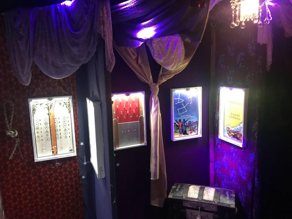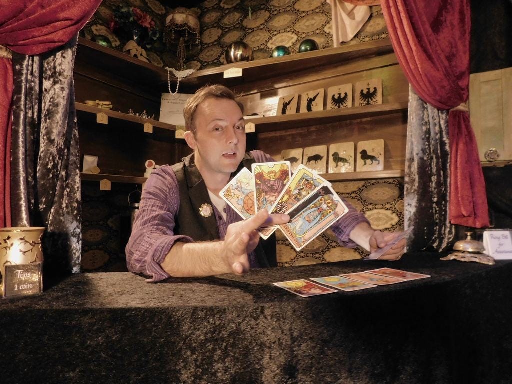Kevin: So, the premise of the room is that you’ve stumbled into a fortune teller’s, uh…fortune telling space and you can ask for a reading. Surprise surprise, something’s gone wrong and Grace, the proprietor of the fortune-telling establishment has disappeared after interacting with a special deck of Tarot cards, so her protege, Matthias has to give the reading.