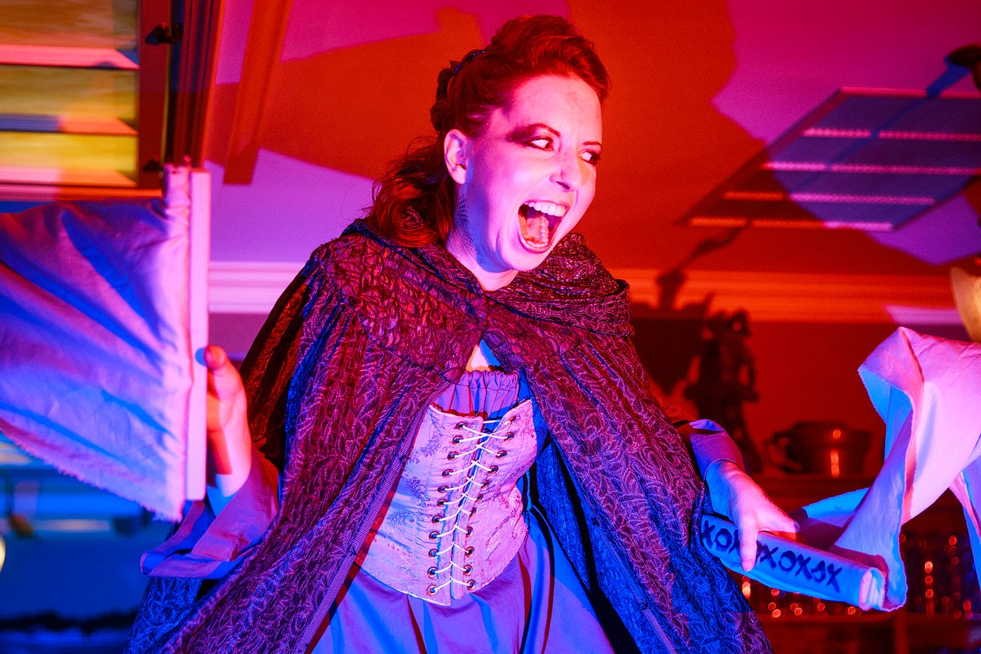 As Eamonn and the others chat, a shadowy figure across the room catches my eye, the slightest of hand motions beckoning me closer. I’m drawn to them and they pull me into a small, darkened room. This person (or rather this mystical creature, who I would later come to know as The Dark, played by Collin Quinn Rice) presses me for details on what Eamonn’s told me. After conveying what I know, The Dark pulls me close, warning, or perhaps pleading, not to trust what Eamonn says, before releasing me back into the pub. While a lively time is being had on the surface tonight, trouble is clearly brewing underneath.