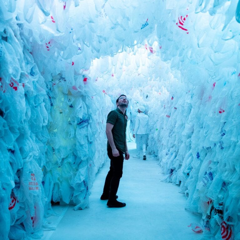 The Plastic Bag Store at MASS MoCA is a clever and impactful immersive installation. It starts as a satirical grocery store filled with plastic parodies, drawing you in with humor and creativity. But it quickly becomes so much more, transforming into a multi-dimensional theatrical experience. Created by artist Robin Frohardt, it first premiered in NYC in 2020 and is now showing at MASS MoCA as part of their ongoing exploration of socially impactful immersive art.