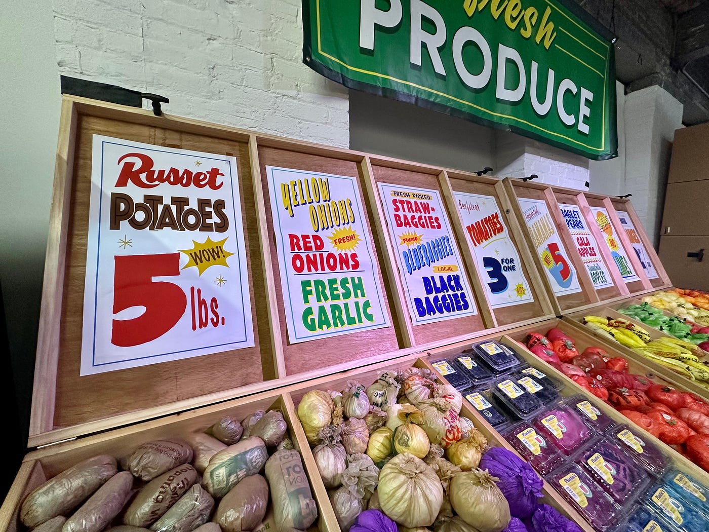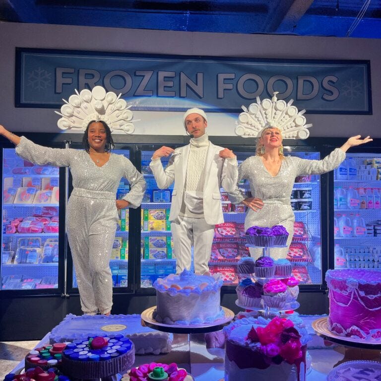 Plastic bag potatoes; cakes made of bottle caps; copies of “Bags Illustrated” line the magazine racks. It’s silly, but technically kind of amazing. And it’s a lot of fun. I enjoyed wandering fake aisles stocked by fake employees (museum docents trained as immersive actors) noticing all the ways creator Robin Frohardt turns everyday products on their head.