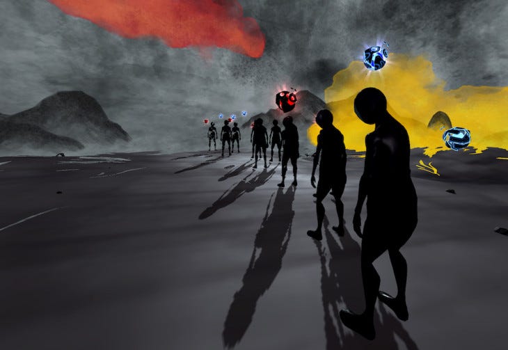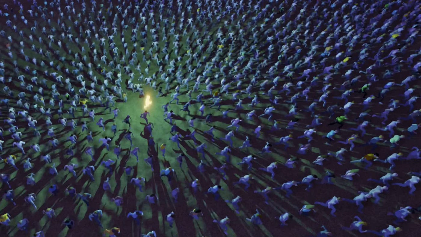 This super-short VR experience completely forgoes a narrative and instead thrusts you into a weird space and place. You are floating amid a huge sea of nondescript bodies in a desert-like land. They’re all running in the same direction, practically trampling each other, and you’re going a different way, towards the golden beams of light ahead. When you hit the first beam of light, you change directions and start moving towards the next one, slowing traversing the landscape and occasionally running into the crowd again.