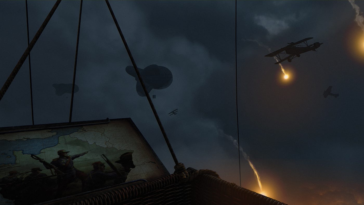 In my previous experience with War Remains, I explored the vast set wearing a VR headset, headphones, and backpack, and feeling my way around with my hands and feet. The new version is more of a linear experience where I step into a hot air balloon, walk around a trench, and witness a tank battle. This PC VR War Remains experience feels more like a “dark ride” with Carlin narrating, taking me from scene to scene with the rendered environments around me fading in and out at appropriate times. There are moments where I am literally propelled forward through the story through a smooth zooming motion and I start to feel slightly queasy, but they pass quickly. I do miss the feeling of the wind on my face that I recall from the first time I was lifted into the hot air balloon in the piece, and the rumbling beneath my feet that let the experience feel so real. And while technically the participant can try to walk around within each scene in this version, it doesn’t fundamentally change their experience and the footprint of each scene is fairly constrained.