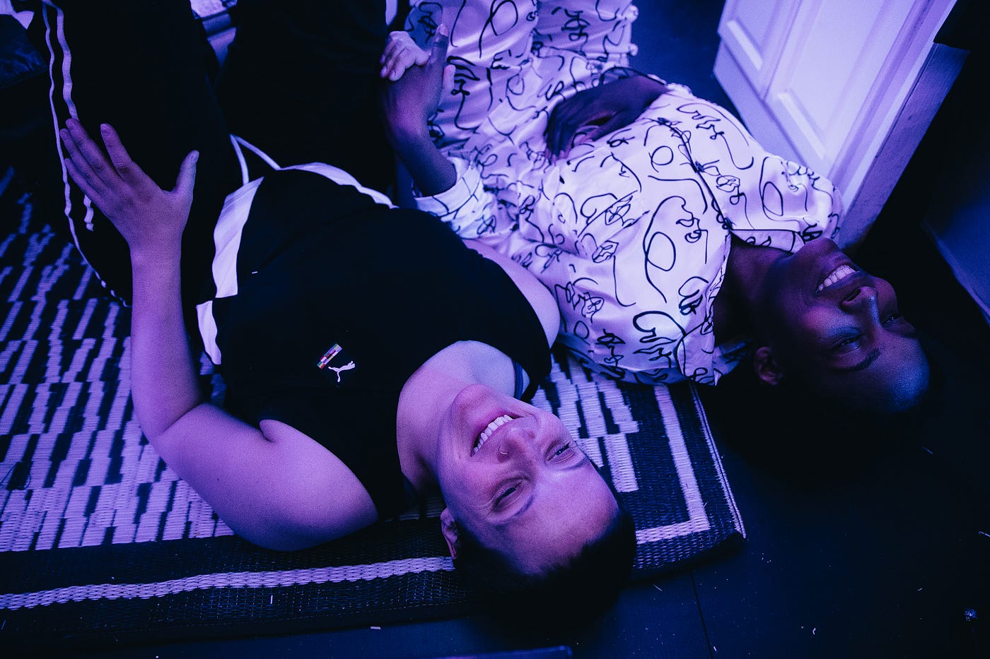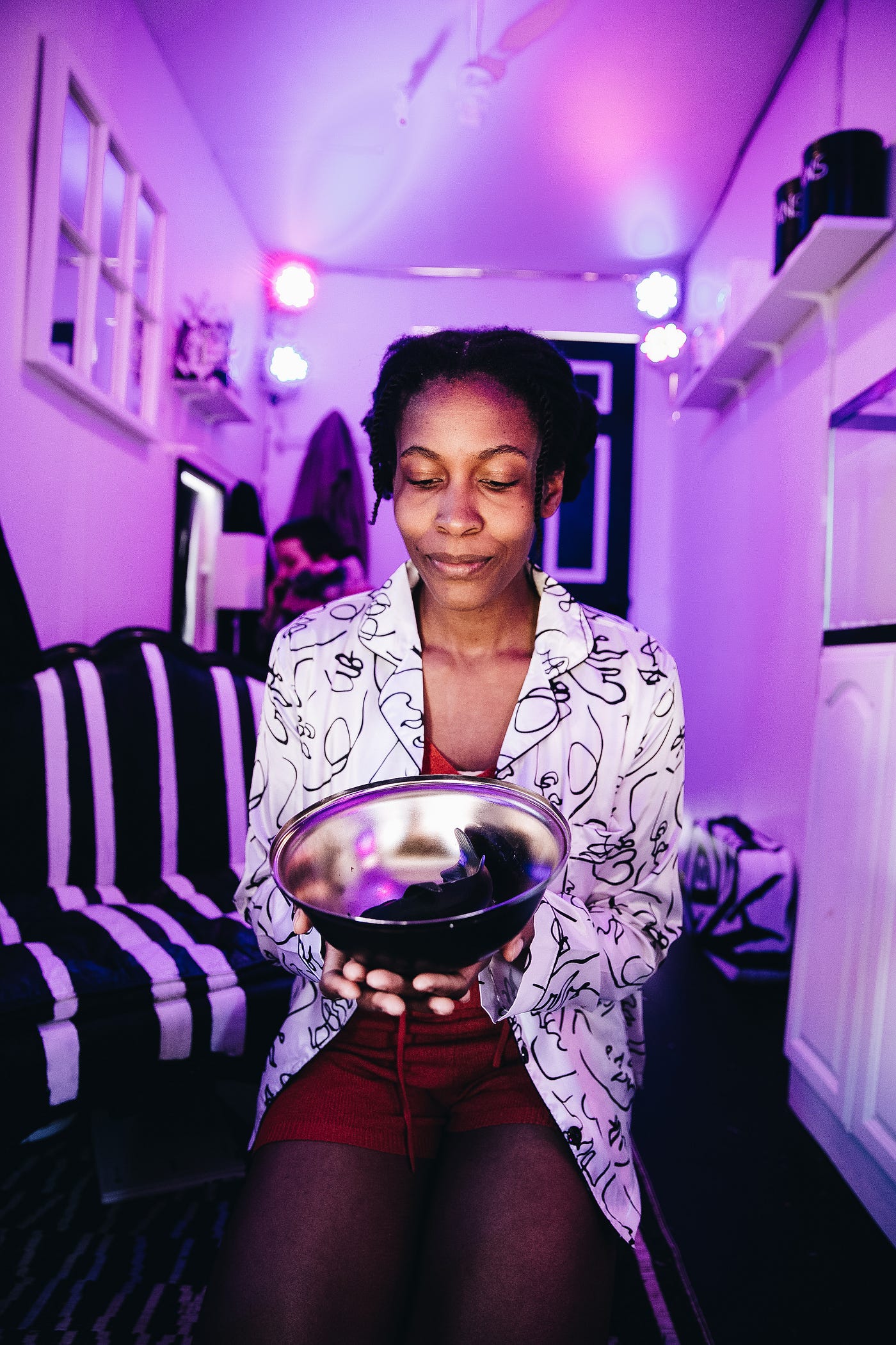 I nervously take my seat under the black muslin on the other side of the apartment’s TV screen. Other audience members get comfortable in front of the fish tank, a calendar, or a portrait. The sound of a disembodied voice and music come in through the headphones connected to an MP3 player. The curtains are pulled open and we can see Angel (Starr Kirkland, alternating with Vanessa Lynah for some of the shows) and Bae (Leana Gardella, alternatively Jules Forsberg-Lary) cozied up on the couch, each of them staring either at a laptop or a phone. A peaceful diorama of the “before” moment.